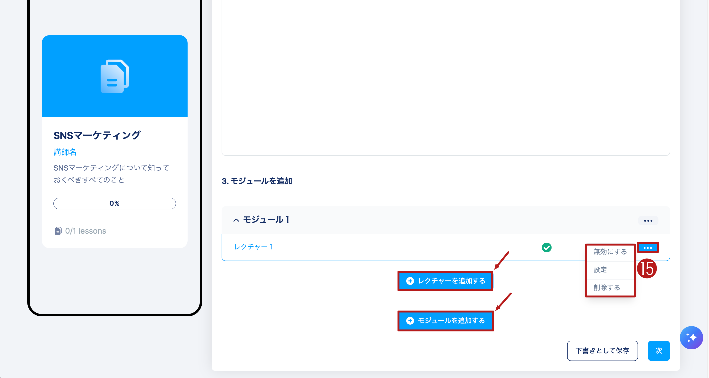 最初のレクチャーが準備できました!モジュールやレクチャーを編集するには、その横にある3点メニュー (15) をクリックします。