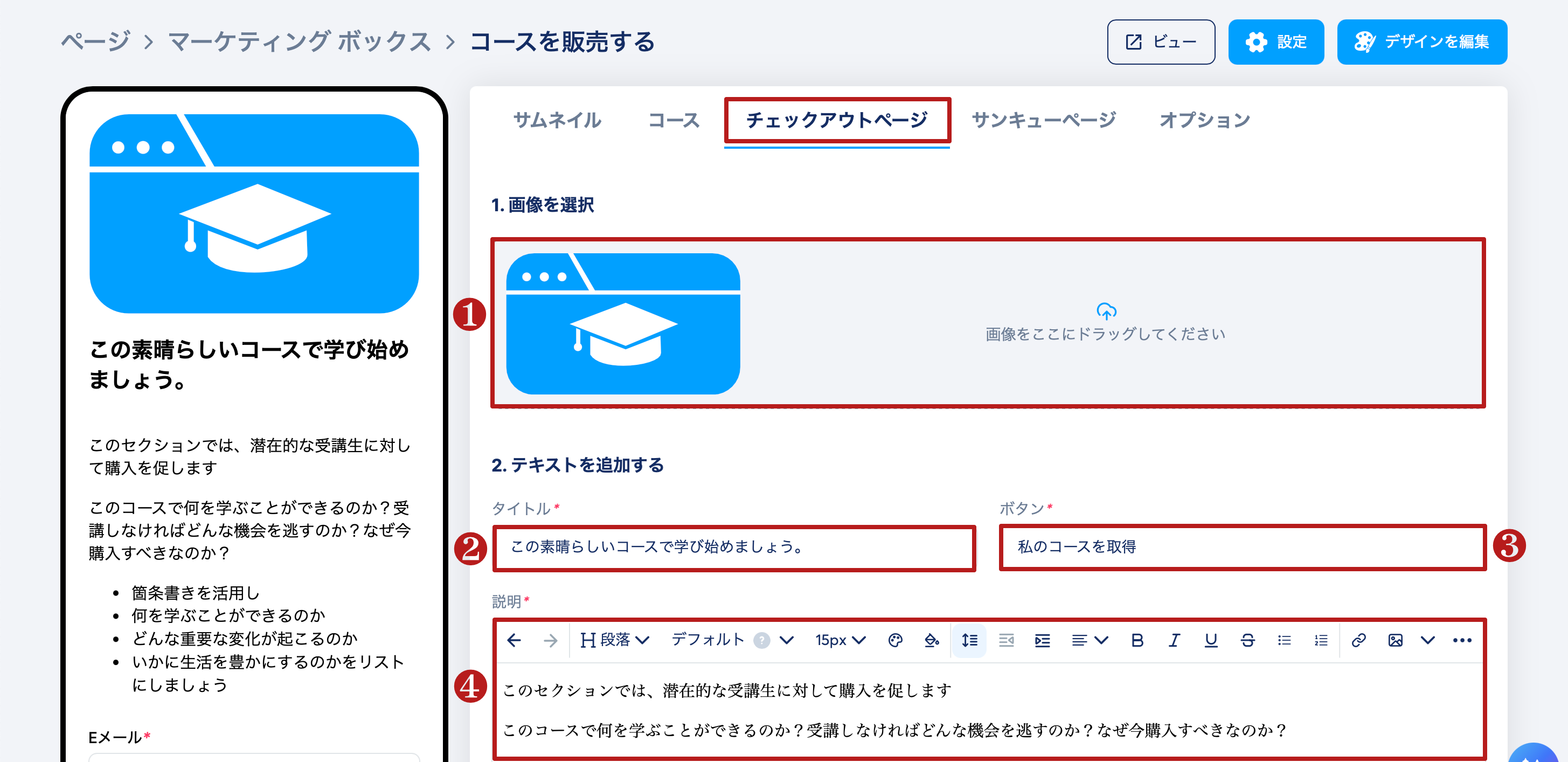 次をクリックしてチェックアウトページ設定を開きます。ここでは、画像(1)、タイトル(2)、ボタンテキスト(3)、説明(4)を設定する必要があります