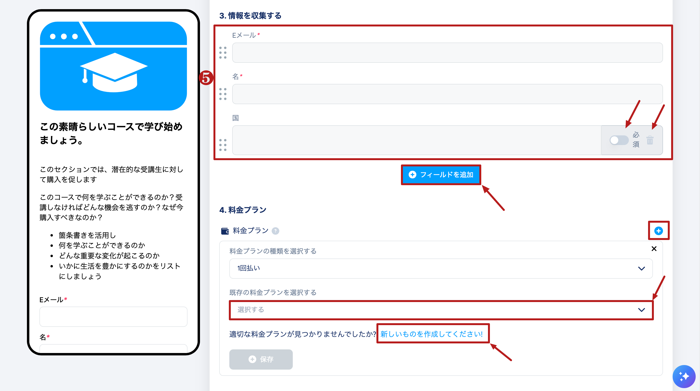 情報を収集するで、リクエストする顧客データフィールドを選択します(5)。必要に応じてフィールドを追加をクリックして項目を追加します。