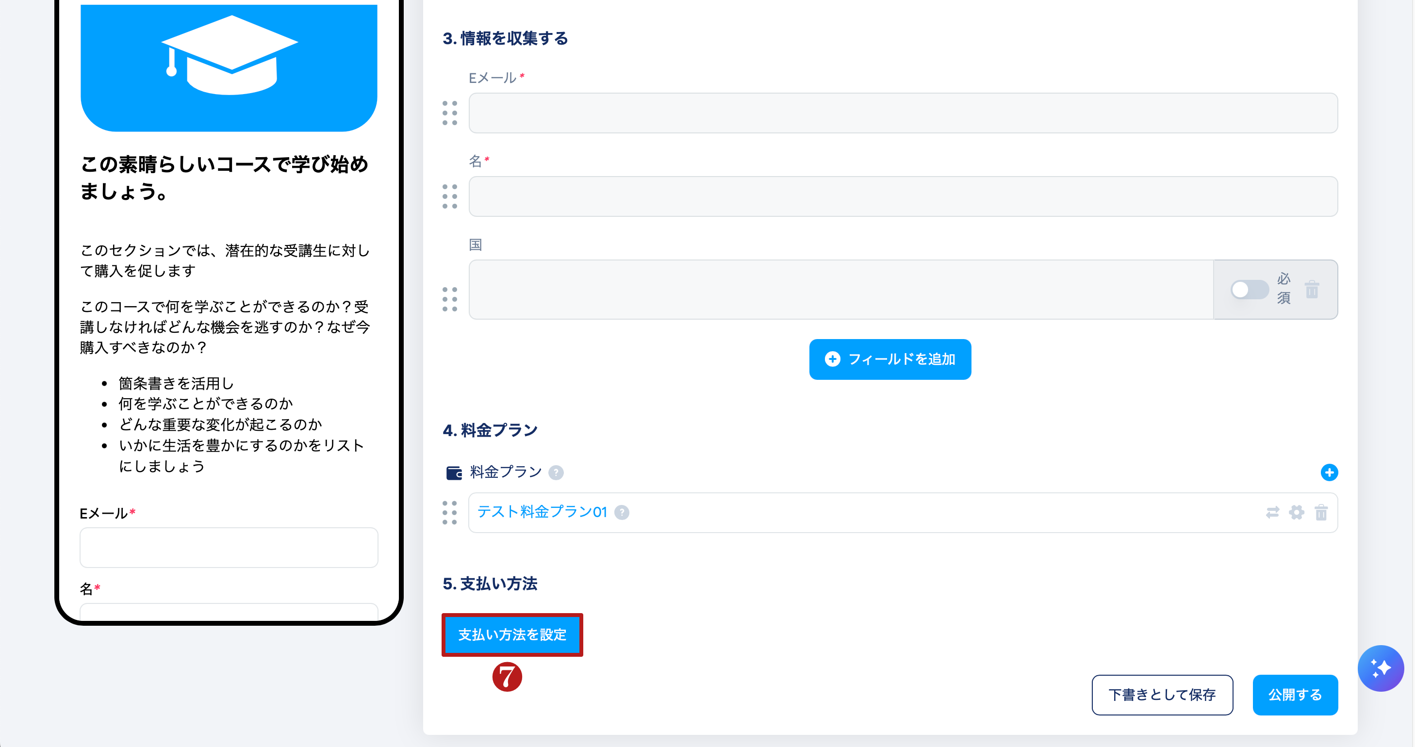 通貨や支払いゲートウェイを設定するには、支払い方法を設定 (7) をクリックします。