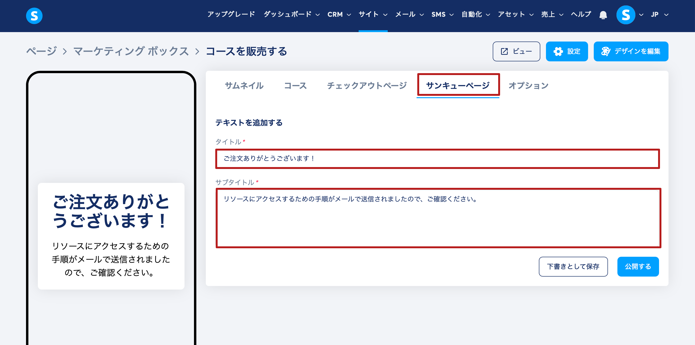 サンキューページタブで、購入後に表示するタイトルとサブタイトルを追加します。