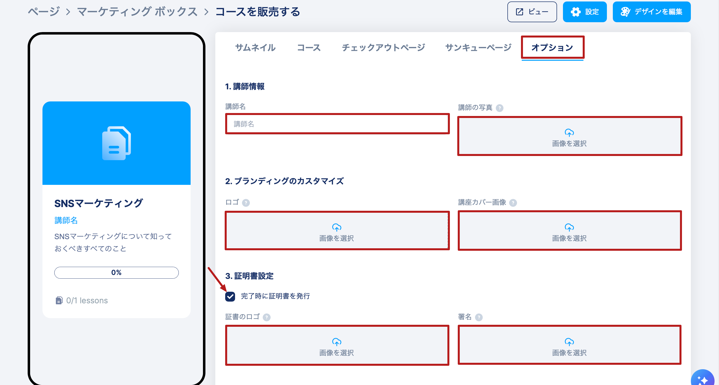 最後に、オプションタブを使用して、講師プロフィール、ブランディング(ロゴとカバー)、および証明書(修了証)設定をカスタマイズします。