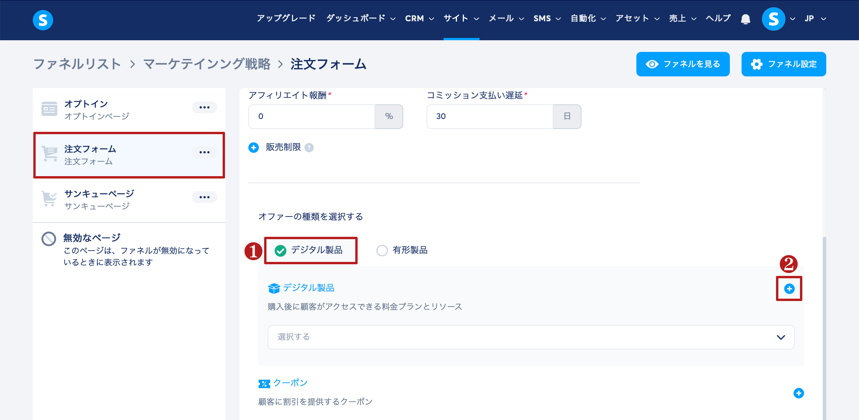 注文フォームステップで、デジタル商品(1)を選択し、プラス(+)ボタン(2)をクリックします。