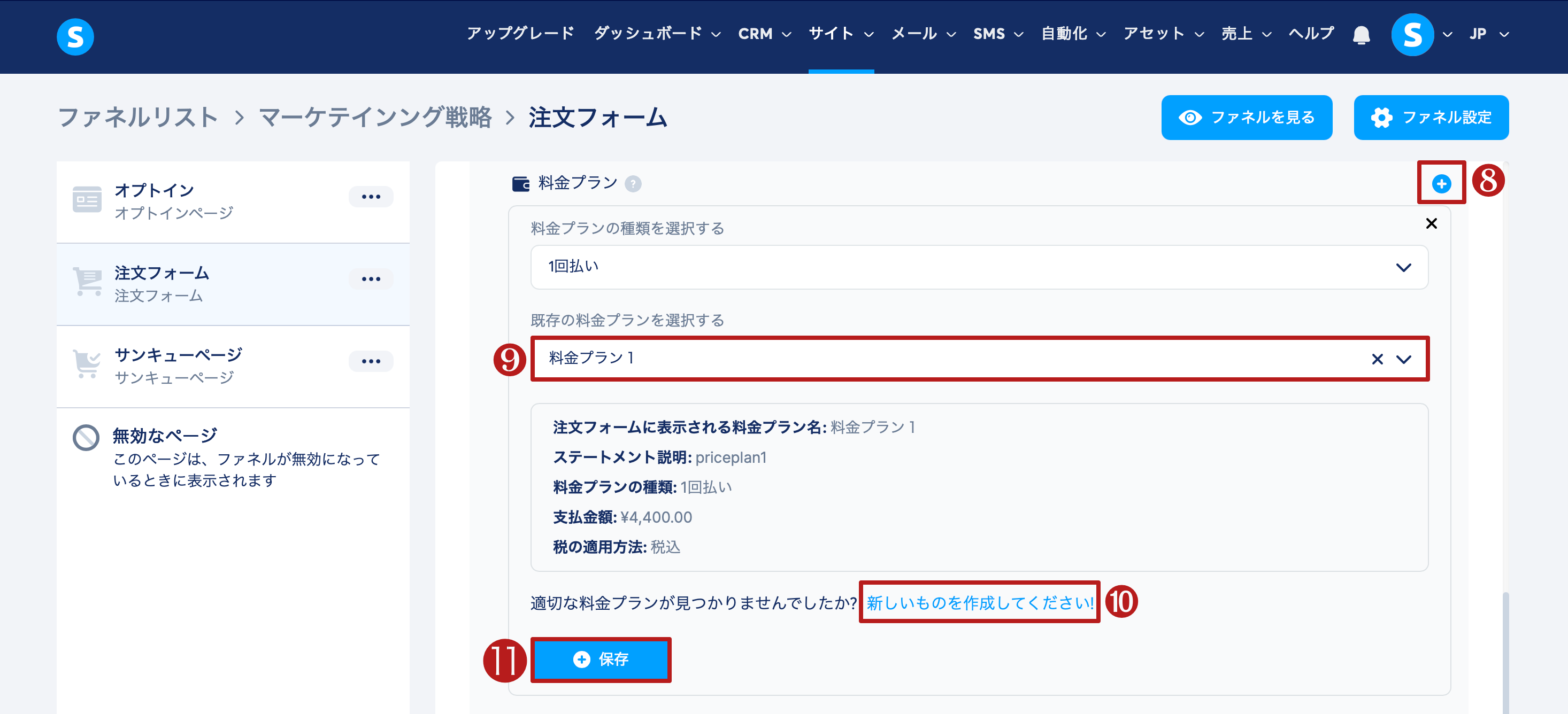 プラス(+)ボタン(8)をクリックします。既存の料金プラン(9)を選択するか、新しいものを作成してください(10)をクリックします。